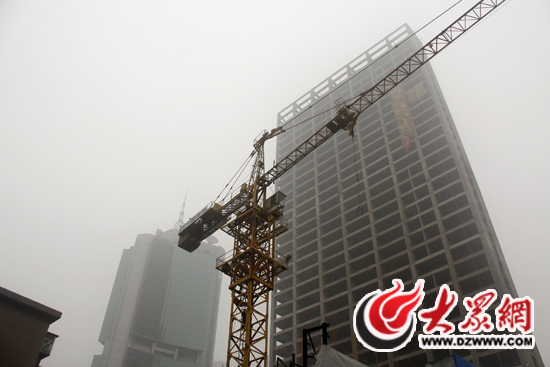 受霧霾天氣影響,由于能見度降低,不少建筑工地的高空作業(yè)已經(jīng)停止。