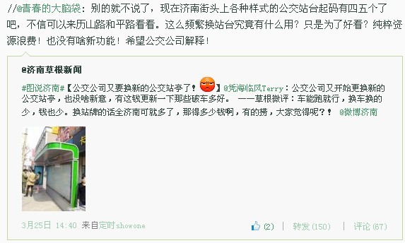 近日,網友“憑海臨風Terry”將新候車廳的照片傳到微博上,并評論:“公交公司又開始更換新的公交站亭,也沒啥新意,有這錢更新一下那些破車多好。”博文在經微博名人“濟南草根微博”轉發后,迅速引起了數百網友的大討論。
