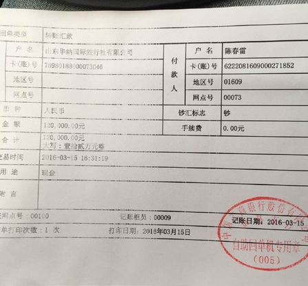 在報案的同時,與張欣有著同樣遭遇的許多消費(fèi)者,對旅游部門以及山東華納國際旅行社有限公司和中國國旅(山東)國際旅行社等沒有及時做好監(jiān)管,提出了質(zhì)疑。有的消費(fèi)者還在網(wǎng)上貼出了一張向山東華納國際旅行社有限公司轉(zhuǎn)賬匯款12萬元的單據(jù)。