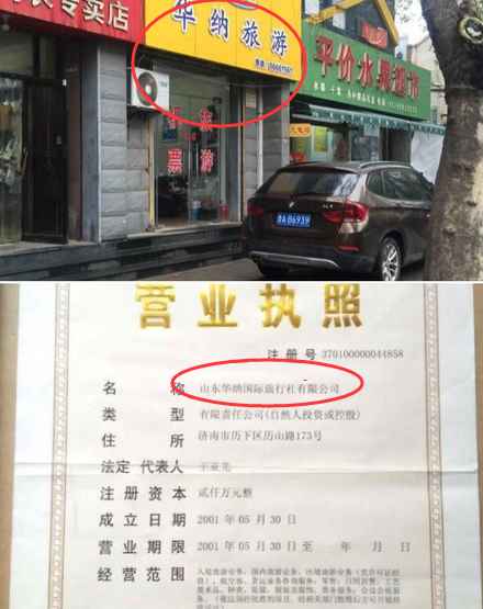 在張欣的微博里,她貼出了帶有疑似中國國旅(山東)國際旅行社有限公司公章的收據(jù)等相關(guān)證據(jù)。另有一張照片顯示為尹偉的名片,上面標(biāo)注有中國國旅(山東)國際旅行社營業(yè)部經(jīng)理等字樣,另外還有一張照片顯示尹偉疑似擁有名稱為“山東華納國際旅行社有限公司”的營業(yè)執(zhí)照。記者發(fā)現(xiàn),尹偉日常經(jīng)營的門店也有“華納旅游”字樣的標(biāo)識。