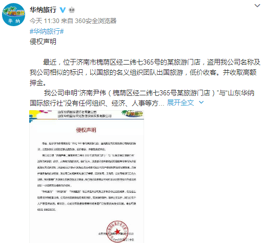 對此,今天上午11點30分,山東華納國際旅行社有限公司通過官方微博回應(yīng)稱尹偉所為系盜用該公司名稱及相似的標(biāo)識,與其沒有任何組織、經(jīng)濟(jì)、人事方面的關(guān)系。同時,中國國旅(山東)國際旅行社有關(guān)工作人員表示,網(wǎng)上貼出的照片中涉及該公司的公章是尹偉假冒的,該公司前幾天在發(fā)現(xiàn)尹偉私刻該公司的公章后,已向公安機(jī)關(guān)報案。