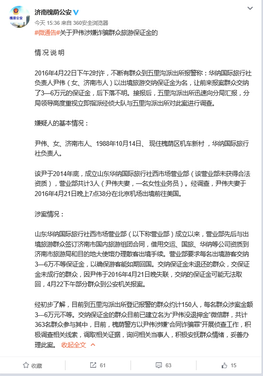 山東華納國際旅行社西市場營業(yè)部(以下稱營業(yè)部)成立以來,營業(yè)部先后與出境旅游群眾簽訂濟(jì)南市國內(nèi)旅游組團(tuán)合同,借用交運(yùn)、國旅、華納等公司資質(zhì)到濟(jì)南市旅游局和目的地大使館辦理散客出境手續(xù)。營業(yè)部要求每名出境游客交納3—6萬不等保證金,以確保游客能如期回國。交納保證金未退還的群眾,交保證金未成行的群眾,因尹偉于2016年4月21日晚失聯(lián),交納的保證金可能無法取回,4月22下午部分群眾到公安機(jī)關(guān)報案。經(jīng)初步了解,目前到五里溝派出所登記報警的群眾約計150人,每名群眾涉案金額3---6萬元不等。交納保證金的群眾目前已建立名為“尹偉沒退押金”微信群,共計363名群眾參與其中,目前,槐蔭警方以尹偉涉嫌“合同詐騙罪”開展偵查工作,積極調(diào)查相關(guān)線索,調(diào)取相關(guān)證據(jù),詢問相關(guān)當(dāng)事人,積極安撫群眾情緒,妥善辦理此案。
