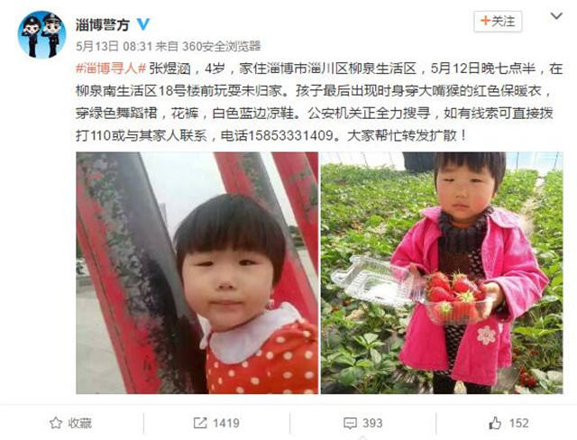 山東省淄博市公安局官方微博@淄博警方2016年5月13日08時31分許發布消息稱:#淄博尋人# 張煜涵,4歲,家住淄博市淄川區柳泉生活區,5月12日晚七點半,在柳泉南生活區18號樓前玩耍未歸家。孩子最后出現時身穿大嘴猴的紅色保暖衣,穿綠色舞蹈裙,花褲,白色藍邊涼鞋。公安機關正全力搜尋,如有線索可直接撥打110或與其家人聯系,電話15853331409。大家幫忙轉發擴散!