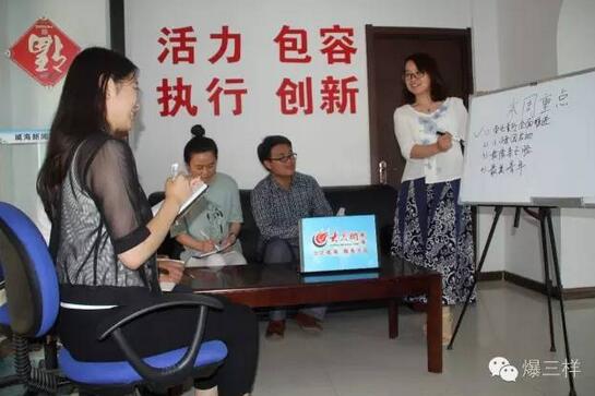 大眾網威海頻道同事們正在開選題策劃會,他們的團隊精神是“活力、包容、執行、創新”。