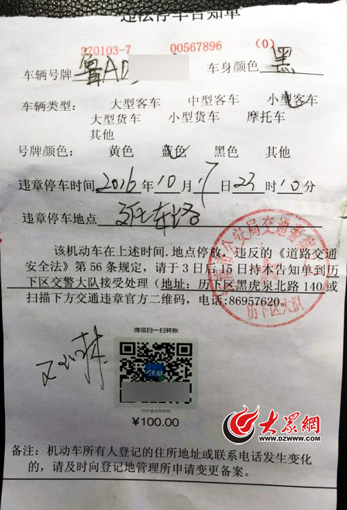 “該機動車在上述時間.地點停放,違反的《交通安全法》第56條規(guī)定,請于3日后15日持本告知單到歷下交警大隊接受處理,或掃描下方交通違章官方二維碼”。今天上午,濟南網(wǎng)友“果凍”在微博上發(fā)布了這樣一張異樣的違停罰單照片,從圖片來看這張罰單不僅語病百出,而且下方的二維碼尤其別扭。