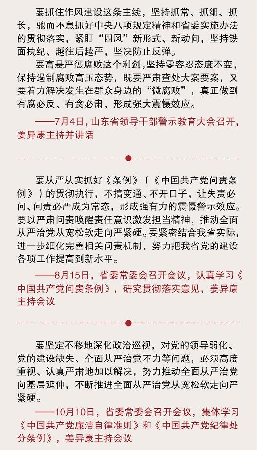 黨的十八大以來,黨中央作出全面從嚴(yán)治黨的戰(zhàn)略部署,把黨風(fēng)廉政建設(shè)提到前所未有的高度。在山東省紀(jì)委十屆七次全體會議上,省委書記姜異康也強調(diào),要牽住管黨治黨“牛鼻子”,讓全面從嚴(yán)治黨主體責(zé)任落地生根。