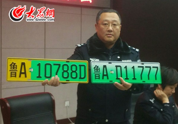 大眾網記者在濟南市車管所看到,小型新能源汽車號牌底色采用漸變綠色,大型新能源汽車號牌底色采用黃綠雙拼色,其中“魯A”字樣為黃色。新能源汽車號牌號碼由5位升為6位,比普通汽車號牌增加一位,外形也比普通號牌長4厘米。車管所民警介紹說,小車號碼為魯A之后接字母“D”,再接5位數字;公交車等大型車的號碼為魯A之后接5位數字,再接“F”。其中“D”代表純電動汽車,“F”代表非純電動汽車、插電式混合動力和燃料電池汽車。