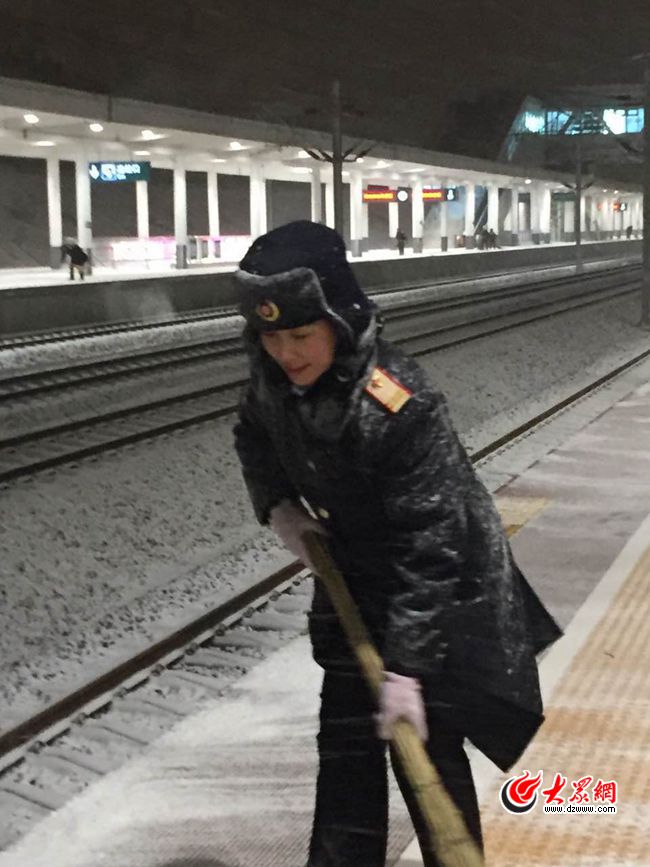 下午5點27分,一輛從威海駛來的列車上有一位剛做完手術的老人,行動不太方便 。李好提前準備好了輪椅,在站臺等候,等老人到站后,一路推著老人直到老人上車離開。晚上7點,李好帶著大家在站臺上清掃了兩個多小時的積雪,晚上九點半才回到宿舍,倒頭就睡。這個夜晚,她又將在站上度過。