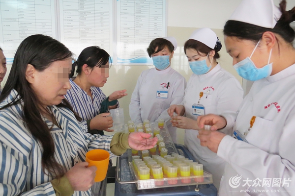 上午10點,是患者的服藥時間。護士們會看著每一位患者將藥物服下。“患者需要每天按時服藥,但有些患者比較‘調皮’,會把藥藏在嘴里,趁我們不注意時再吐掉;有的甚至會摳自己喉嚨,把吃下的藥吐出來。我們必須要看著每位患者服藥,并仔細檢查,確定患者將藥服下后才能放心!崩钋迦A說。