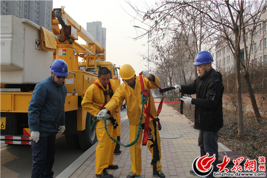 “掛好安全帶。”班長李海濤大聲喊道。1月26日14點20分,在濱州市黃河一路渤海十六路附近的黨校十支線26號電桿,一處螺絲松動引發刀閘發熱,很容易燒斷線路,嚴重的話會影響大線路安全運行,濱州供電公司配電運檢室帶電作業班的李海濤、張默迪、湯洪沂和常龍龍正在進行帶電作業。