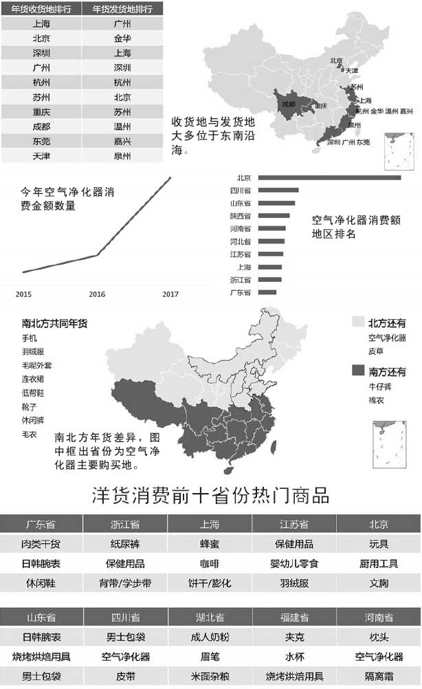從收貨城市來說,北上廣深的市民年貨買得最勤。排在后面的是蘇杭成渝,都是響當當的經濟發達地區。從年貨發貨地區來看,大都集中在東南沿海,很可惜,無論是收貨還是發貨,山東都沒有城市上榜。看來濟南和青島的“剁手族”和店主,你們還要加把勁啊!