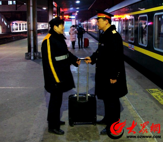 2月14日,情人節。濟南車務段泰山站工作人員趙健與妻子都敬偉照例同時“上崗”。一大早,睡了不到3個小時的趙健早早來到天橋等候妻子,倆人見面后,趙健連忙把妻子手中的行李箱接到手里,陪著妻子去站臺等車。