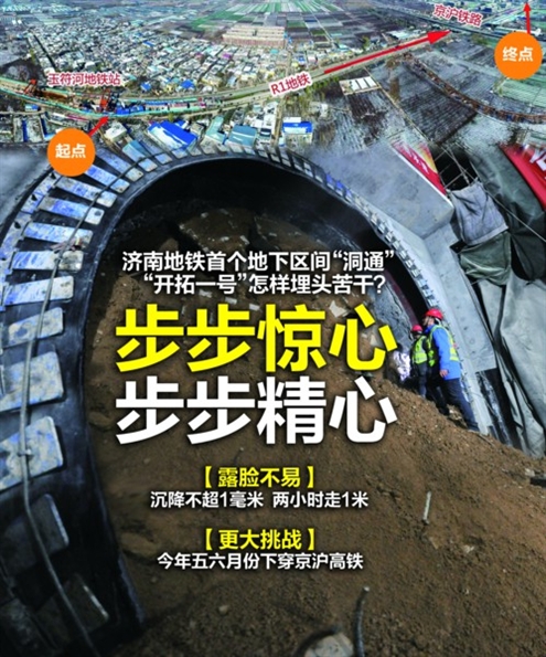 據(jù)了解,此次貫通的玉符河站-王府莊站盾構(gòu)區(qū)間,沿劉長山路延長線向北運(yùn)行,然后向東轉(zhuǎn)至劉長山路到達(dá)王府莊站,區(qū)間總長近1300米。盾構(gòu)機(jī)“開拓一號”從2016年7月23日順利始發(fā),到2017年2月22日破土而出,歷時7個月共推進(jìn)1080環(huán)接近1300米。