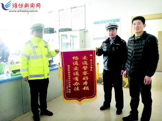 2月23日上午,李先生來到奎文交警大隊三中隊,送上一面錦旗,表示感謝。