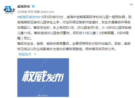 大眾網(wǎng)5月9日訊 今天下午,據(jù)威海市政府新聞辦官方微博@威海發(fā)布消息,5月9日8時(shí)59分,威海中世韓國(guó)國(guó)際學(xué)校幼兒園一租用車輛,到威海高新區(qū)接幼兒園學(xué)生上學(xué),行經(jīng)環(huán)翠區(qū)陶家夼隧道時(shí),發(fā)生交通事故并導(dǎo)致車輛起火。事故發(fā)生時(shí),車上有司機(jī)1名,幼兒園老師1名,3—6歲幼兒園學(xué)齡前兒童11名。事故造成幼兒園老師重傷,司機(jī)和11名兒童(5名韓國(guó)籍,6名中國(guó)籍)死亡。