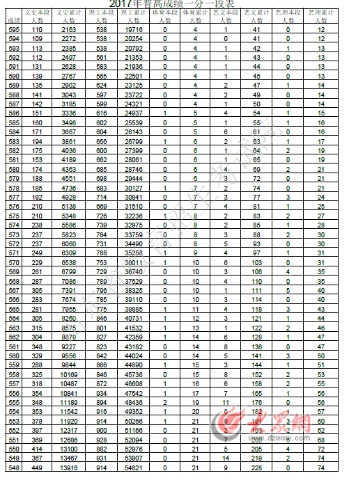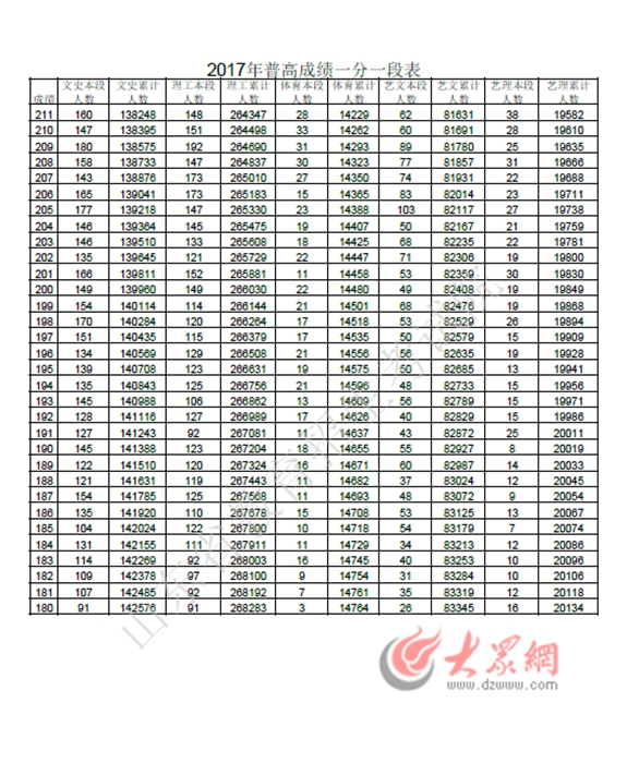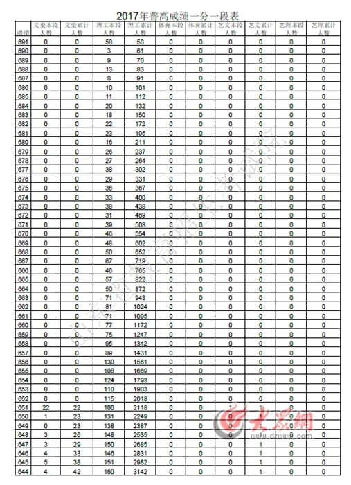 大眾網濟南6月24日訊 24日下午,山東2017年夏季高考一分一段表公布,其中理科691分以上者58人,文科651分以上者22人。