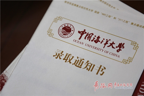 今年,中國海洋大學錄取通知書新增二維碼,新生入學報到時,只需掃描二維碼,即可完成整個報到流程。除此之外,海大錄取通知書繼續延續往年版式,封面以海大具有代表特色的魚山校區校門和六二樓,使用石板畫線條形式表現,顏色使用金、玫瑰紅,彰顯學校悠久的歷史和厚重的文化積淀。據了解,海大是全國少有的幾所將學生照片放到錄取通知書上的學校。“海大對錄取通知書的設計有準確的定位。錄取通知書中英文使用大宋體,用豎式玫瑰紅色條反金黃字放在畫面右側,通知書折起或展開時都可以呈現錄取通知書中英文,畫面設計有‘金榜題名’印章,突出體現了錄取通知書的設計定位。”海大招辦主任劉賀介紹。