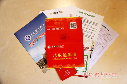 7月30日,青島大學首批共27個省份8180人的錄取通知書正式寄出。青大錄取通知書整體采用金黃色調。封面的上半部分配以玫紅色的校徽,下半部分則印有手繪的學校正門和圖書館的彩圖,校訓“明德博學守正出奇”八個大字書寫在圖書館的右側墻壁上。 “具有青春流行元素的手繪彩圖是文學院的學生畫的,已使用多年,每年只是在色調等方面會有一定的調整,也是防偽的一種方式。”青大招辦主任解濤介紹。