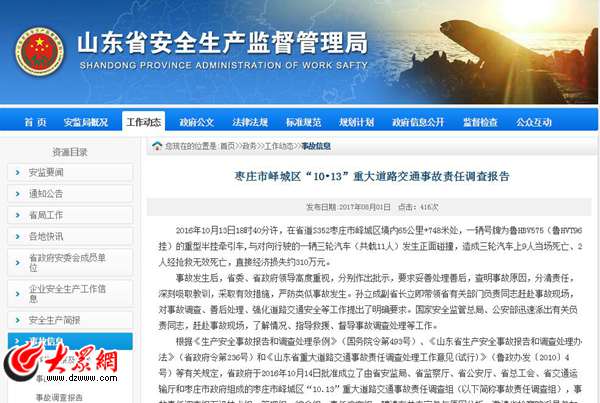 報告顯示,經調查認定,棗莊市嶧城區“10·13”重大道路交通事故是一起重大安全責任事故。