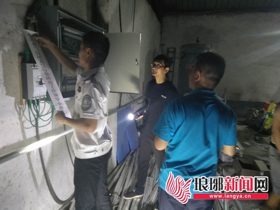 8月9日晚,蘭山街道辦事處環(huán)保夜查小組巡查十二家企業(yè),現(xiàn)場(chǎng)封停了八家。圖為夜查小組對(duì)“散亂污”企業(yè)斷電停產(chǎn),貼封條。