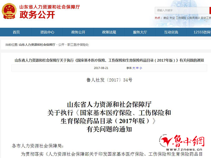 大眾網8月23日濟南訊 8月21日,山東省人力資源和社會保障廳印發關于執行《國家基本醫療保險、工傷保險和生育保險藥品目錄(2017年版)》有關問題的通知。自2017年9月1日起,全省基本醫療保險、工傷保險和生育保險統一執行2017年版《國家藥品目錄》和人社部發〔2017〕54號文件確定的36種談判藥品,藥品通用名、藥品分類、劑型和限定支付范圍等按照國家規定執行。