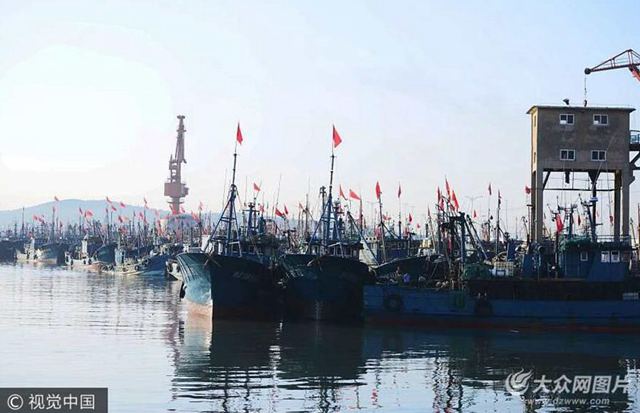 2017年9月1日,山東青島積米崖漁港,碼頭停靠等候出海進行捕撈作業的漁船。
