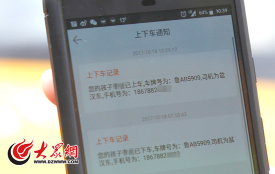 歷城區學生家長手機上收到的孩子上下校車短信
