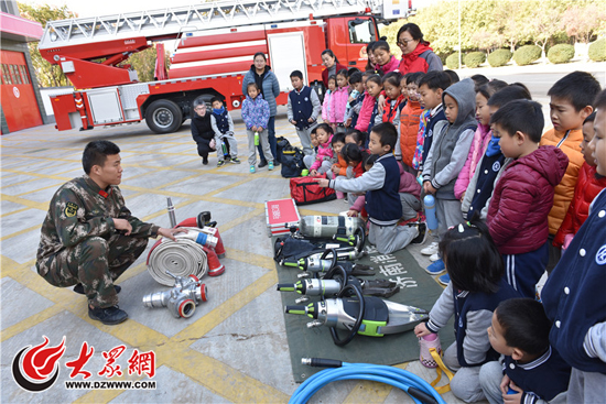 大眾網濟南11月3日訊 今天上午,在全國“消防安全宣傳教育日”即將到來之際,山東師大附小大學城校區的學生們在執行校長于飛的帶領下,開展了 “行走的課堂”課程——走進消防大隊。長清消防大隊大學城中隊指導員胡瑞先帶領消防官兵們為孩子們上了一堂生動的消防安全課。