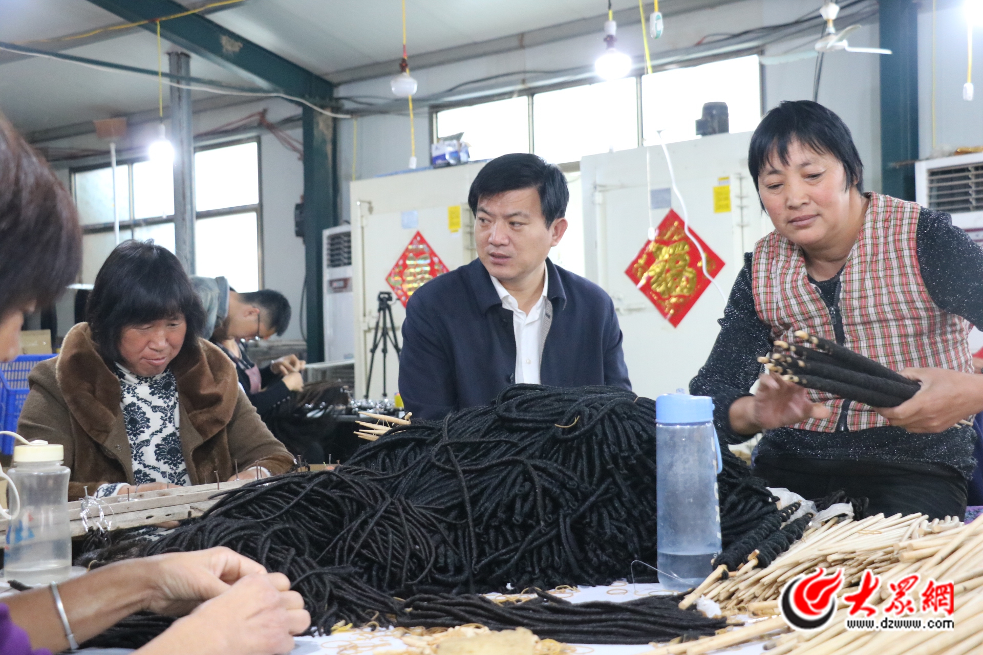 董口鎮黨委書記李玉如(中)在扶貧車間調研,了解貧困戶工作情況