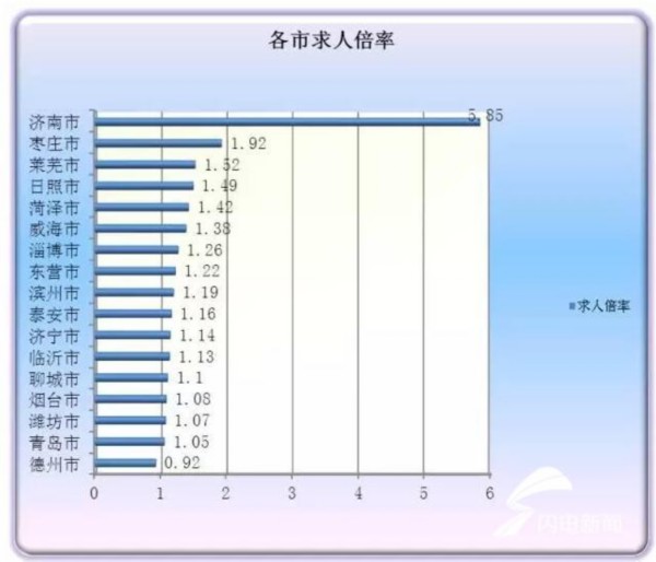 求人倍率可以反應一個統計周期內勞動力市場的供需狀況,是勞動力市場在一個統計周期內有效需求人數與有效求職人數之比。當求人倍率大于1,說明職位供過于求;如果求人倍率小于1,說明職位供不應求。從我省情況來看,濟南市用工缺口最大,求人倍率達5.85,我省內僅有德州一地求人倍率小于1。
