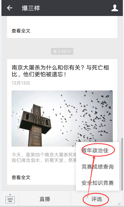 第一步:關注微信公眾號爆三樣,在底部菜單欄點擊評選,然后選擇青年政治佳,進入投票頁面。