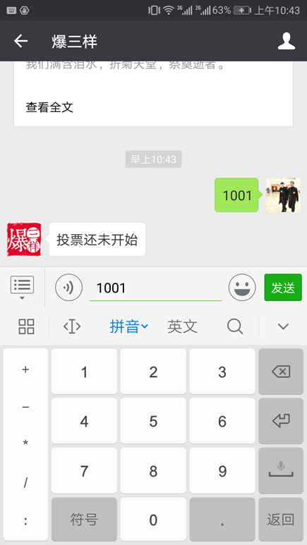 第三步:在投票頁面查詢到選手編號后,假如想給1001號作品投票,可通過給爆三樣留言的方式,輸入編號1001。
