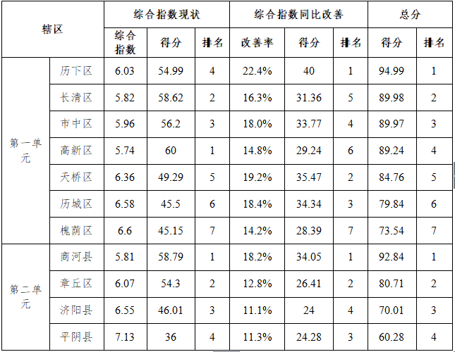 據(jù)統(tǒng)計,11月份,濟南市空氣質(zhì)量第一單元得分從高到低依次為歷下區(qū)、長清區(qū)、市中區(qū)、高新區(qū)、天橋區(qū)、歷城區(qū)和槐蔭區(qū);第二單元得分從高到低依次為商河縣、章丘區(qū)、濟陽縣和平陰縣。