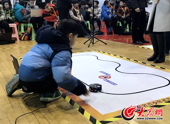 參加循線賽跑項目的小選手,在這個特殊的跑道上,選手操縱的機器人需要按照指定路線,在最短時間內跑完全程。