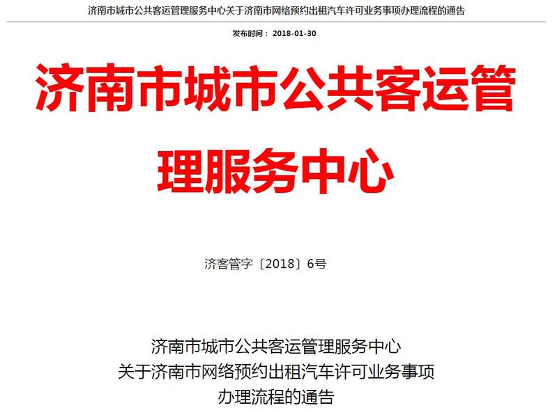 1月30日,濟南市交通委網站發布了《濟南市城市公共客運管理服務中心關于濟南市網絡預約出租汽車許可業務事項辦理流程的通告》。