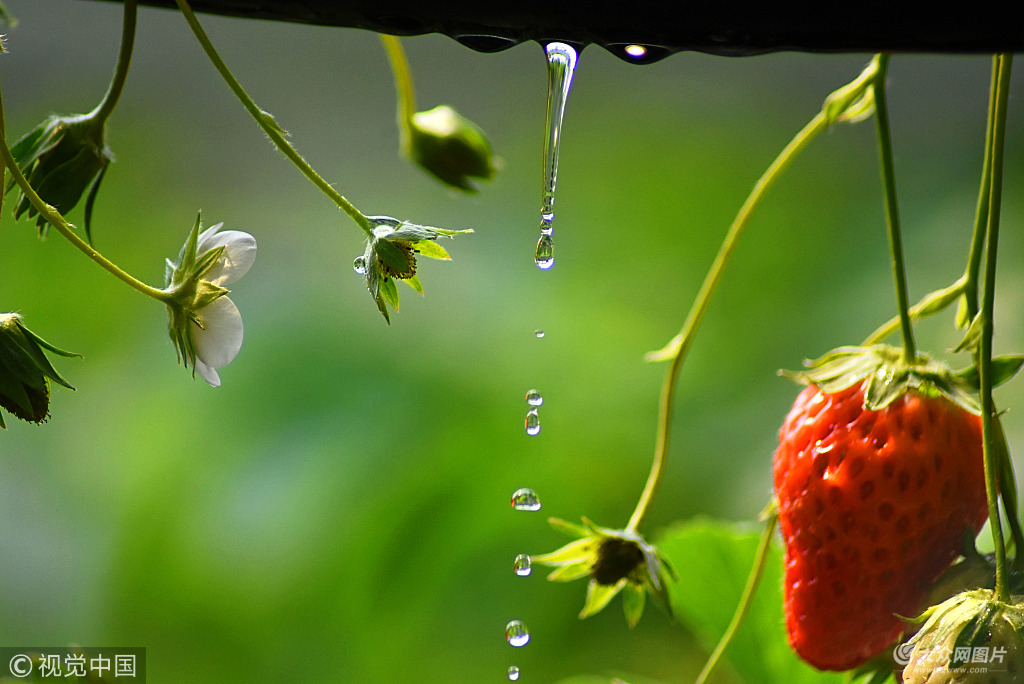 2018年3月23日,在山東省沂源縣東里鎮(zhèn)梅家坡村草莓大棚里拍攝的滴灌節(jié)水設(shè)施。