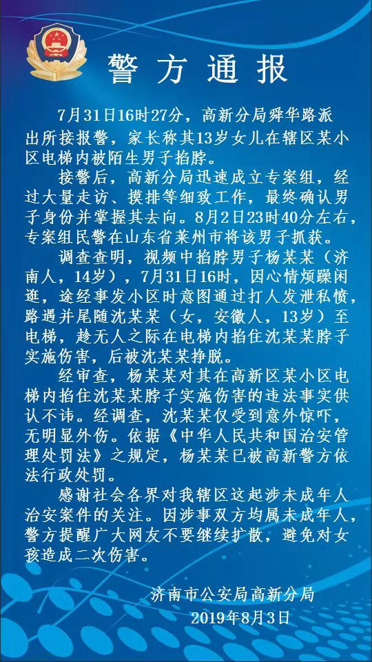經(jīng)警方調(diào)查,掐脖男子楊某某為濟(jì)南人,14歲。7月31日16時(shí)許,楊某某因心情煩躁閑逛,途經(jīng)事發(fā)小區(qū)意圖通過打人發(fā)泄私憤,路遇并尾隨沈某某至電梯,趁無人之際掐住其脖子實(shí)施傷害。警方調(diào)查后發(fā)現(xiàn),被掐脖女孩沈某某僅受到意外驚嚇,無明顯外傷。目前,楊某某已被濟(jì)南市高新警方依法行政處罰。