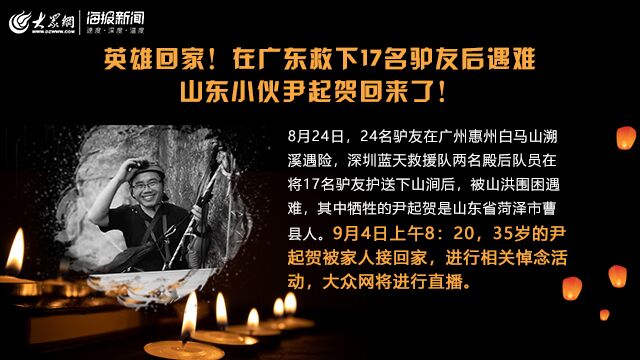 8月24日,24名驢友在廣州惠州白馬山溯溪遇險,深圳藍天救援隊兩名殿后隊員在將17 名驢友護送下山澗后,被山洪圍困遇難,其中犧牲的尹起賀是山東省菏澤市曹縣人。9月4日上午8:20,35歲的尹起賀被家人接回家,進行相關悼念活動,大眾網將進行直播。