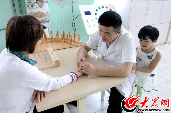 康復(fù)師為手部受傷患者做恢復(fù)鍛煉,孩子一點(diǎn)都不怕醫(yī)生。