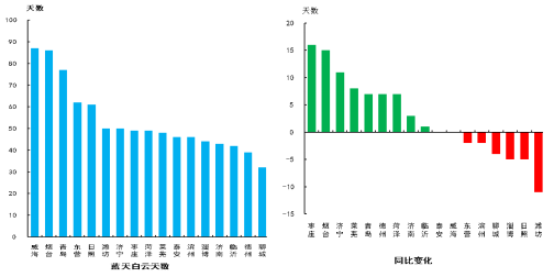 “藍(lán)天白云,繁星閃爍”天數(shù)最多的城市是威海市,為87天,最少的是聊城市,為32天。“藍(lán)天白云,繁星閃爍”天數(shù)同比增加最多的是棗莊市,為16天;泰安市和威海市同比持平;東營等6市同比減少,濰坊市同比減少最多,為11天。