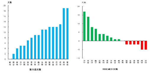 重污染天數(shù)最少的是威海市,為0天,最多的是德州市和聊城市,為19天。重污染天數(shù)同比減少最多的是濟寧市,為17天;青島市同比持平;濰坊市和濱州市同比增加最多,為5天。