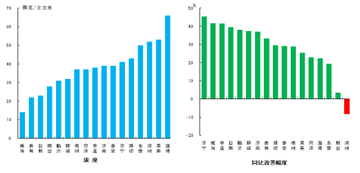 細(xì)顆粒物濃度最好的城市是威海市,為40μg/m3,最差的城市是聊城市,為105μg/m3。12市同比改善,改善幅度最大的是濟寧市,為31.3%;煙臺市同比持平;同比惡化幅度最大的是濰坊市,為15.4%。