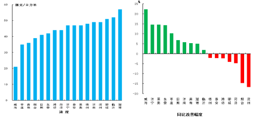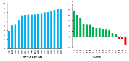 環(huán)境空氣質(zhì)量綜合指數(shù)最好的城市是威海市,為3.94,最差的城市是聊城市,為8.85。14市均同比改善,改善幅度最大的城市是濟寧市,為24.1%;3市同比惡化,惡化幅度最大的城市是濱州市,為7.5%。