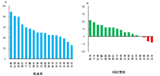 優(yōu)良率最好的城市是威海市,為89.0%,最差的城市是菏澤市,為26.0%。13市同比改善,改善幅度最大的是棗莊市,為21.7個百分點;聊城等4市同比下降,下降幅度最大的是濱州市,為8.0個百分點。