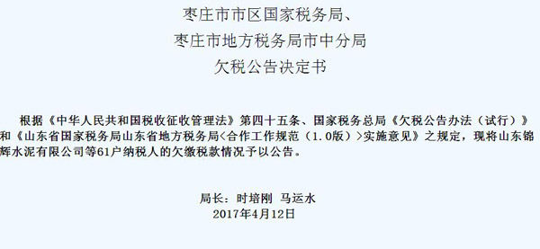 大眾網棗莊4月24日訊 近日,棗莊市市區國家稅務局、棗莊市地方稅務局市中分局發布欠稅公告決定書,對山東錦輝水泥有限公司等61戶納稅人的欠繳稅款情況予以公告,據統計,61戶納稅人共欠繳稅款5973507.4元。
