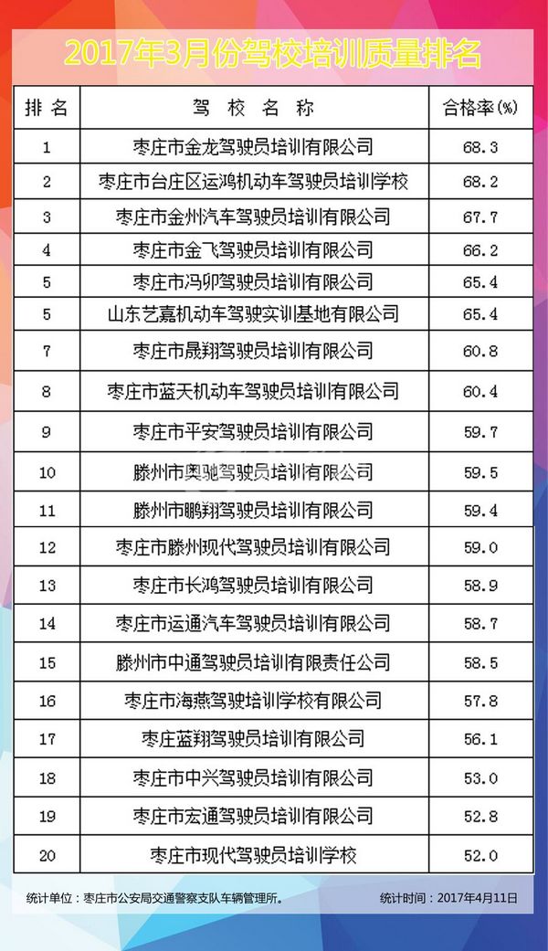 大眾網棗莊4月25日訊(記者 孫姝華)25日,記者從棗莊市公安局交巡警支隊獲悉,棗莊市公安局交巡警支隊公布棗莊市2017年3月份全市駕校培訓質量排名。據了解,棗莊市目前有20家駕駛培訓機構(簡稱:駕校),根據公安部139號令《機動車駕駛證申領和使用規定》的第五十三條規定,棗莊市公安局交巡警支隊按照考試合格率對駕駛培訓機構質量進行公開。