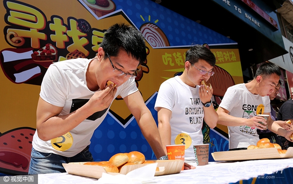 參賽者參加“單人挑戰(zhàn)組”吃面包比賽