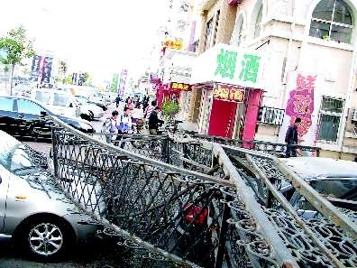 “我正在等人,鐵門就砸過來!眾W迪轎車司機驚魂未定地告訴記者,當時他剛停下車,眼看著鐵門朝他的車砸了下來,“我心想完了,雙眼—閉,幸運的是轟的—聲,砸在了車的后備箱上,雖然后車窗被砸碎,車震了—下,但是人沒受傷。”