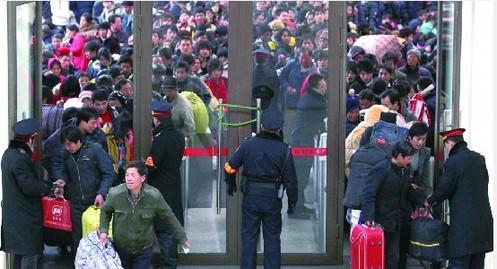青島到鄭州的列車開始檢票,即將踏上回家路的人們急切地走出候車廳 。