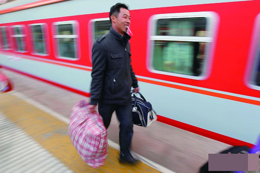 一位旅客即將登上返鄉的列車,激動的心情寫在臉上。